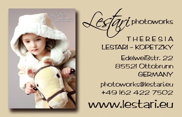 LESTARI p h o t o w o r k s Edelweißstr. 22 85521 Ottobrunn (Landkreis München) GERMANY www.lestari.eu Mobile: +49 162 422 7502 Email: photoworks@lestari.eu Facebook Page: www.facebook.com/Lestari.Photoworks Geschäftsführerin: Theresia Dewi Tri Lestari St-Nr.: 145 / 141 / 20812 USt-ID Nr.: DE814795423 BEHIND THE LENS:  Theresia Dewi Tri Lestari Haben Sie Interesse an einem Photoshooting? Dann rufen Sie mich an oder schicken Sie mir eine Email.